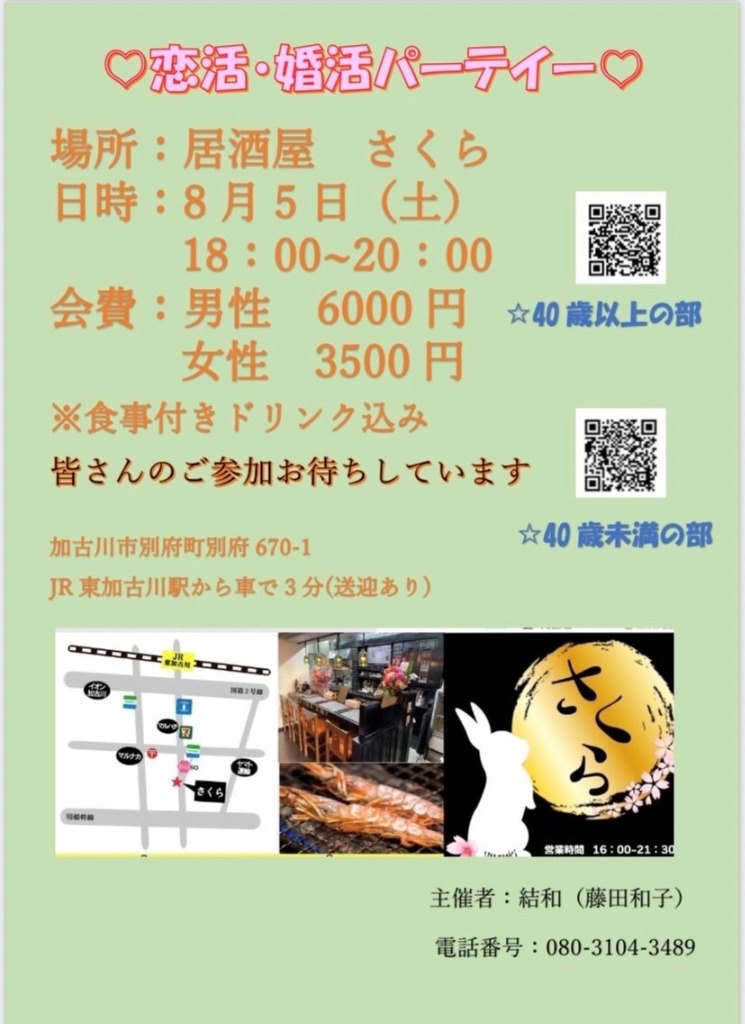 8月5日(土曜日)に加古川にある居酒屋さくら 貸し切りの恋活、婚活パーティーが無事に終了しました。